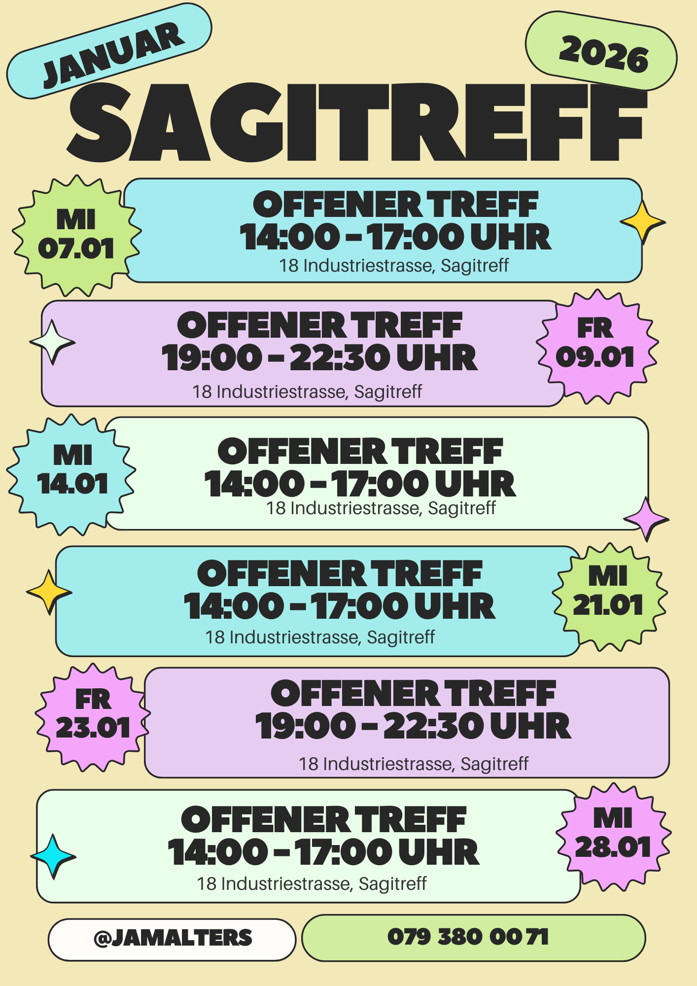 Der Sagitreff dient als Angebot für niederschwellige Umsetzung der offenen Jugendanimation der Gemeinde Malters. Mit seiner jugendgerechten Einrichtung bietet er einen offenen Raum für Begegnungen jeglicher Art. Er bietet die Möglichkeit zur Ausübung verschiedener Tätigkeiten, zur Unterstützung bei Hausaufgaben und Bewerbungsschreiben und zur Umsetzung von eigenen Projekten. Er dient als Raum, in welchem Jugendliche das soziale Miteinander erproben und leben dürfen. Die Angebote orientieren sich an den Bedürfnissen der Jugendlichen. Diese haben im Sagitreff Zugang zu Informationen und erhalten in Bezug auf Fragen der Lebensbewältigung (Schule, Eltern, Beruf, Lebensplanung, Sexualität, Freizeit, Sucht etc.) Unterstützung.